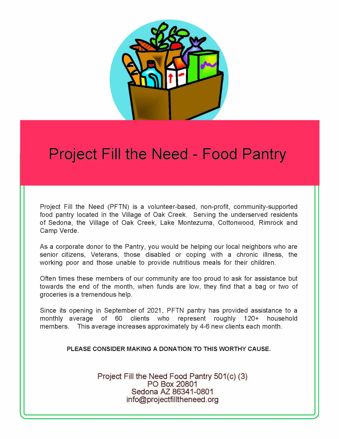 Established in 2021, Project Fill the Need is a 501C(3) charitable corporation that provides food and other items for people in need that live in the Village of Oak Creek, Sedona, Cottonwood, and other Verde Valley areas.